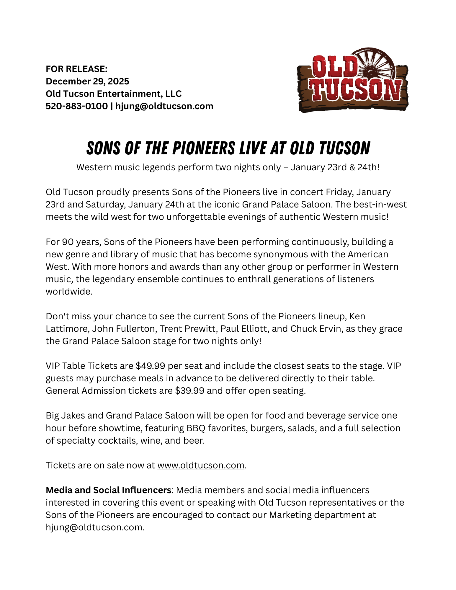 You’ll find Old Tucson’s latest news releases and additional resources below.Â